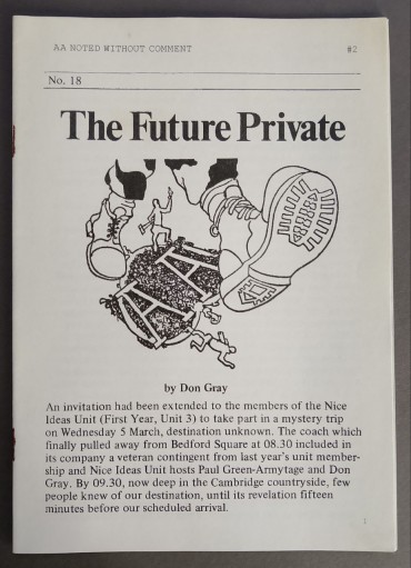 The second edition of AA Noted Without Comment, originally published within Book, Eastside Projects, 2010.This edition presents an assemblage of material that draws upon local exhibition and publication practices, gathered from the AA Archives and more recently from the activities of Bedford Press. Contributors include Don Gray, Sara MacKillop, Samantha Hardingham, Joseph Grigely, Jesko Fezer and Radim Pesko.