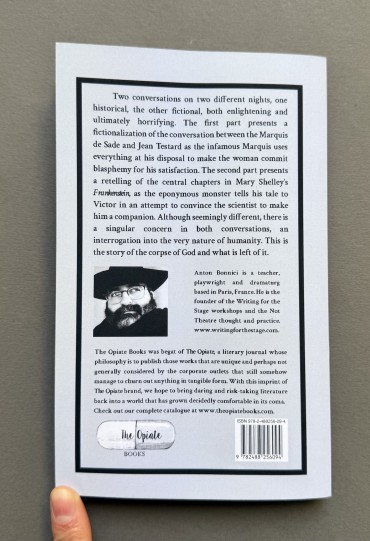 The first part presents a fictionalization of the conversation between the Marquis de Sade and Jean Testard as the infamous Marquis uses everything at his disposal to make the woman commit blasphemy for his satisfaction. The second part presents a retelling of the central chapters in Mary Shelley’s Frankenstein, as the eponymous monster tells his tale to Victor in an attempt to convince the scientist to make him a companion.
