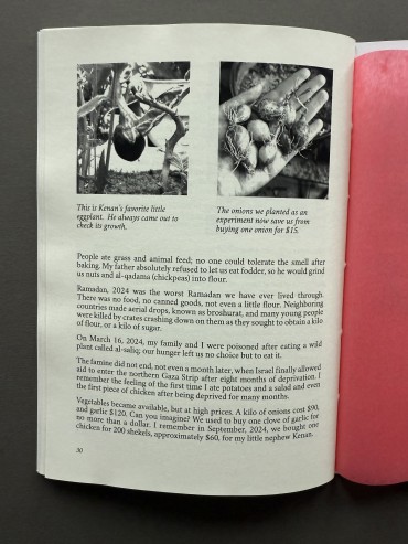 In her articles, Nour documents her struggle to survive, which is multiplied in the lived experiences of everyone else in Gaza: bombardment, displacement, starvation, destruction, loss, death, grief.