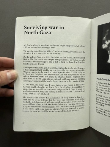 The video was shared around the world, played over and over again, broadcast live-stream—even to people in Gaza, like Nour. Viewing the video immediately forced her to relive the airstrike at al-Nasr School that nearly claimed her own life when she was volunteering as a teacher. She survived. Many of her students did not. We probably saw the footage of that day, too, only to forget it among the images of other schools, other days, other victims. Do the names, the numbers, the places blur together? What about Nour? Can her words, gathered in this zine, hold our attention long enough for us to remember al-Nasr school, the students who died, and their teacher who has not forgotten them?