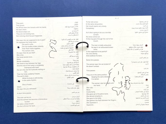 This book is the result of a collaboration between Amin, the visual artist Katharina Marszewski, and the graphic design studio Eps51. Marszewski responded to “The Text” by creating cryptic drawings that reveal the movements central to Amin’s choreographic poetry. Bilingual script and artwork interpenetrate in Eps51’s unique design, which allows readers to determine the reading direction of the book, depending on their preferred language (Arabic / English).